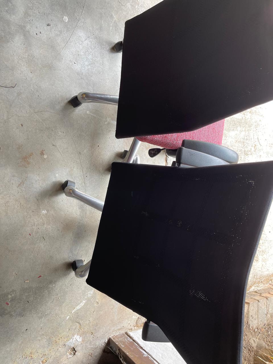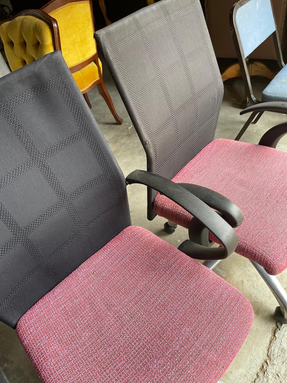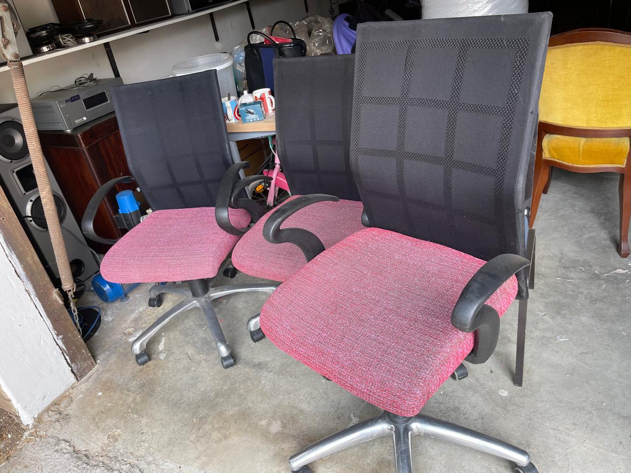 3 office chairs with fabric seats, black mesh backs, and wheels for easy movement. Chairs show some signs of wear but are functional and sturdy. Perfect for a home office, study, or small workspace.