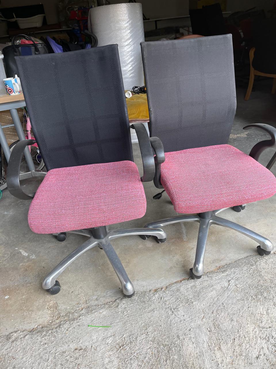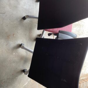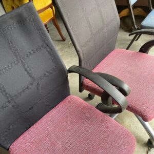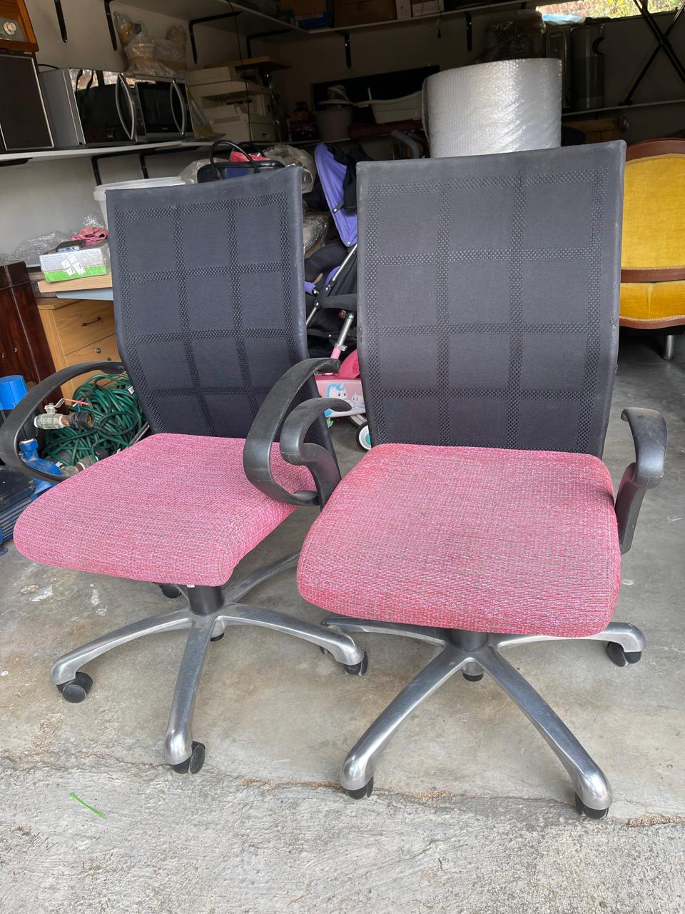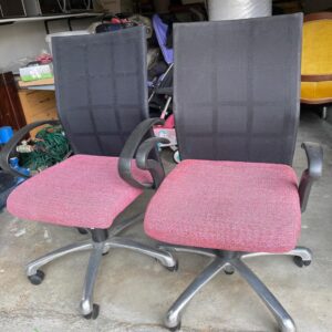 3 office chairs with fabric seats, black mesh backs, and wheels for easy movement. Chairs show some signs of wear but are functional and sturdy. Perfect for a home office, study, or small workspace.
