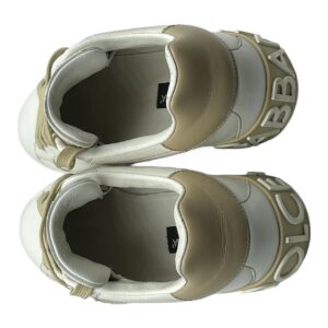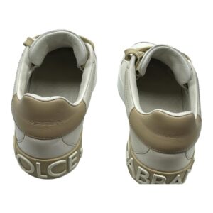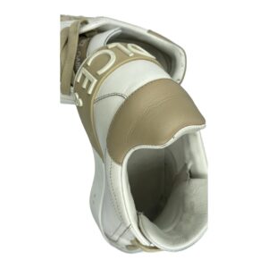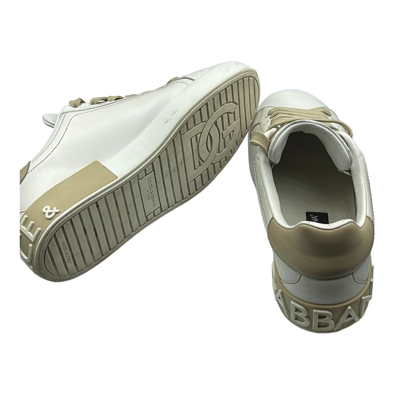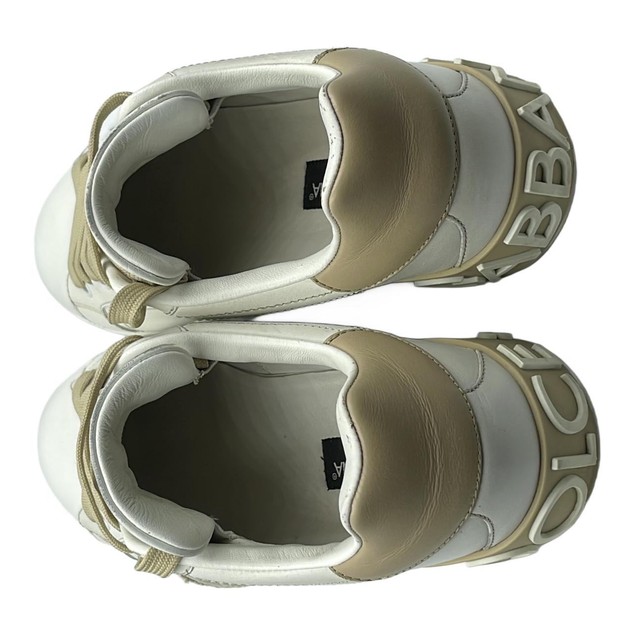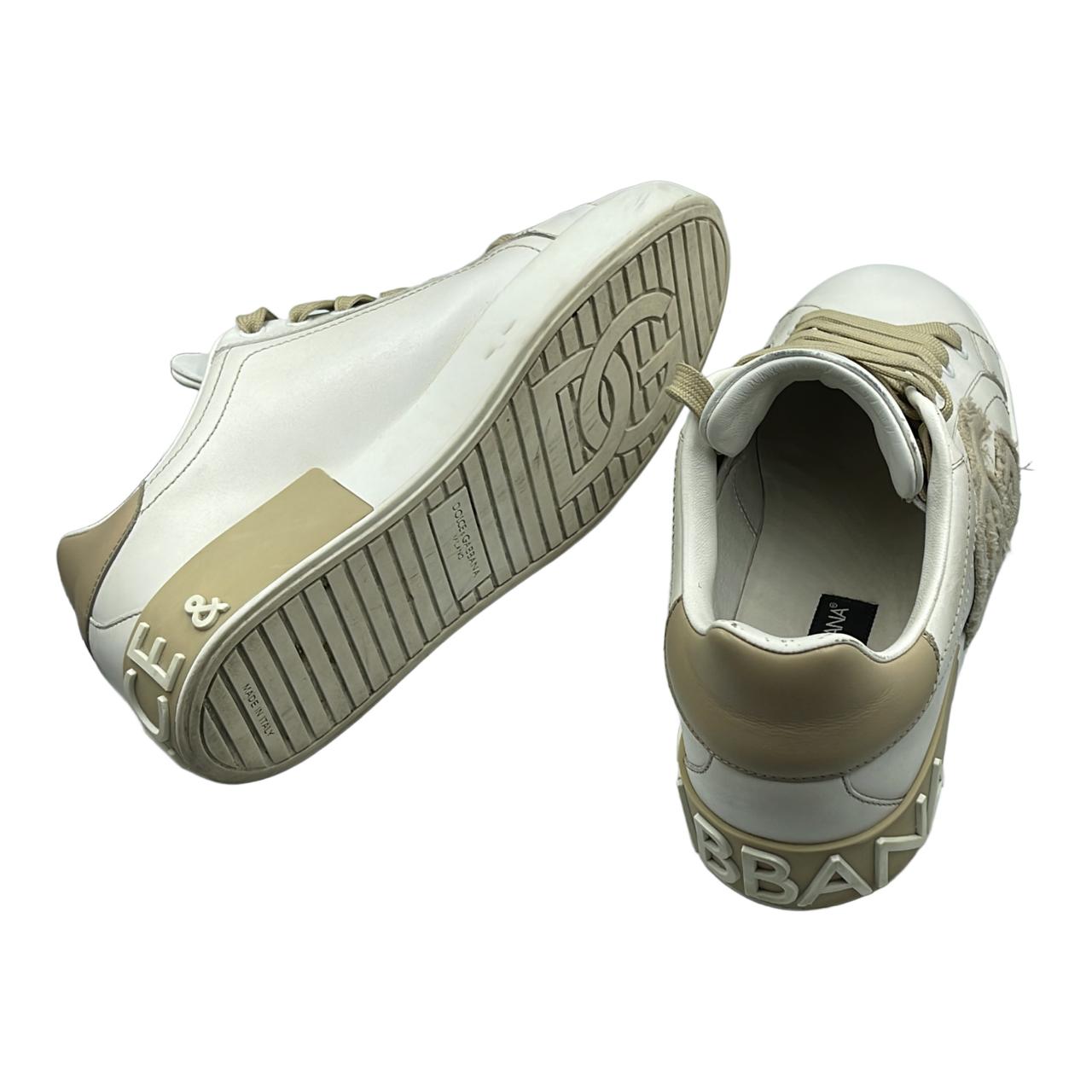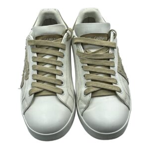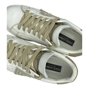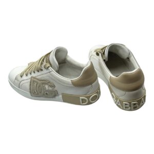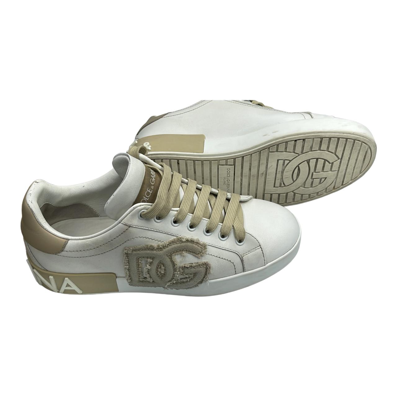 Dolce & Gabbana white leather sneakers with tan accents. Features tan laces, and ‘DG’ patch on the side