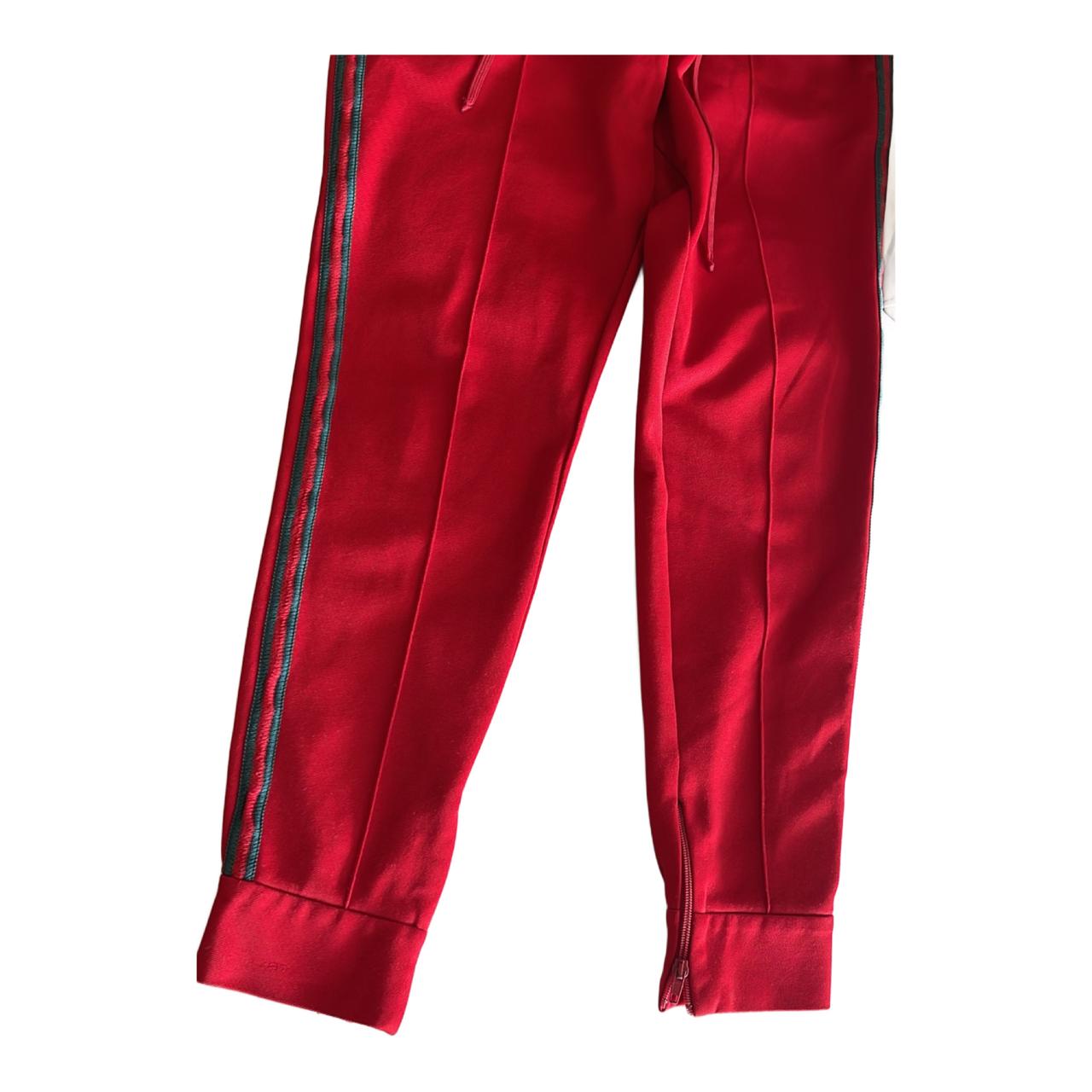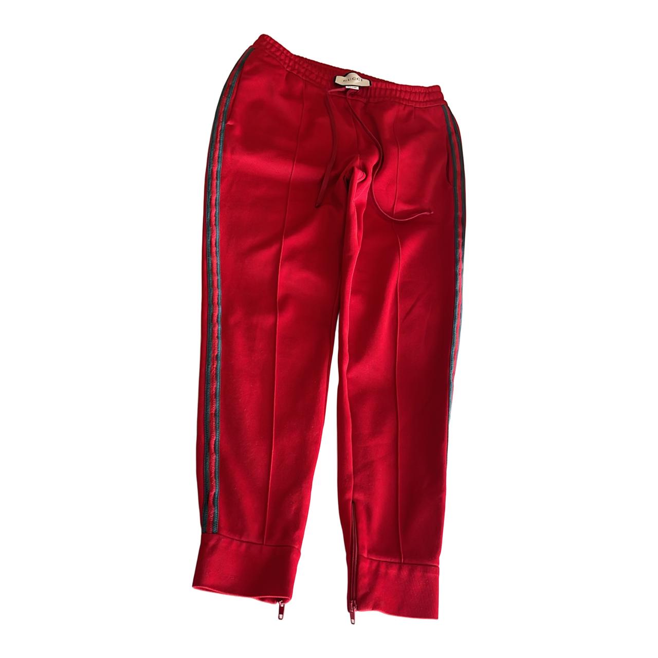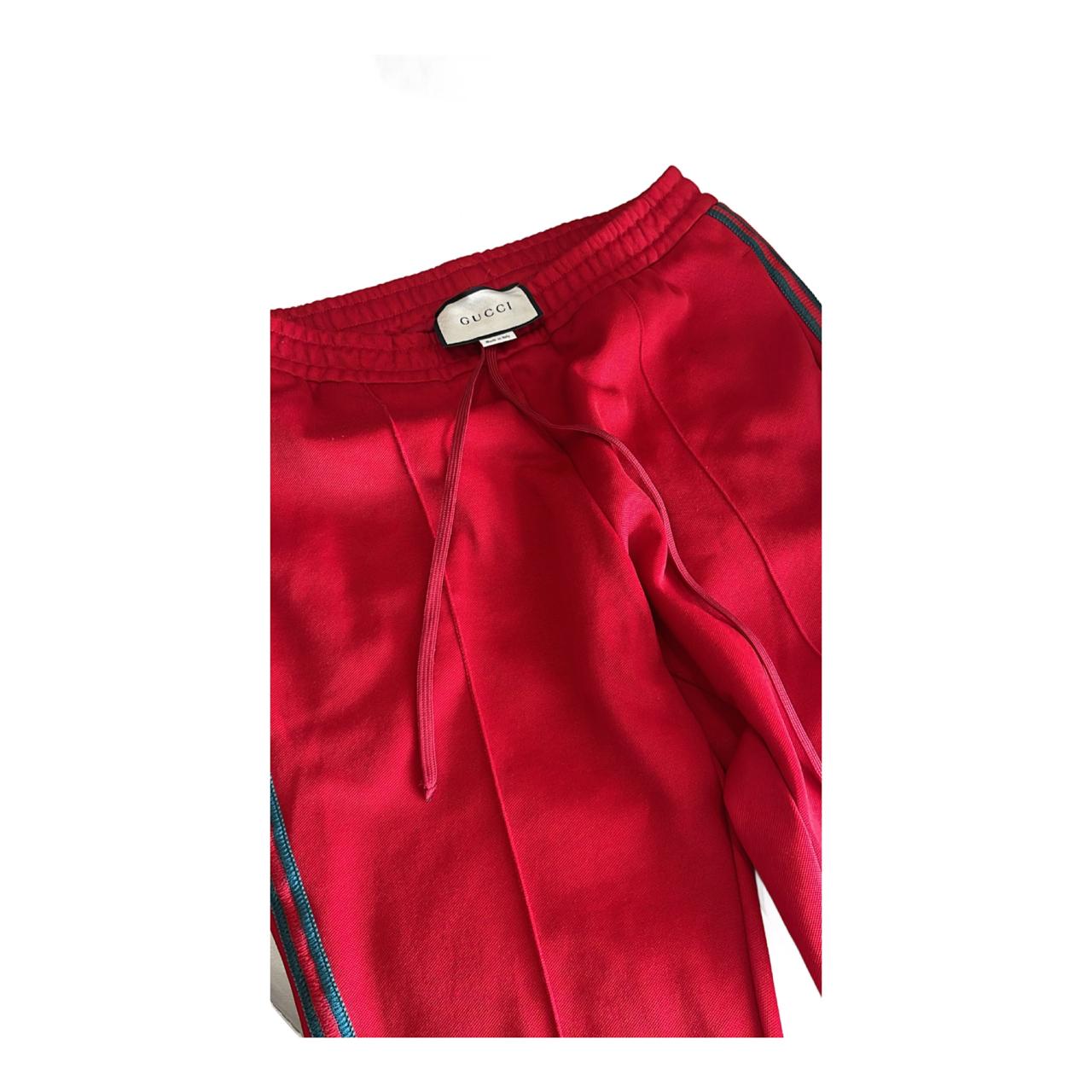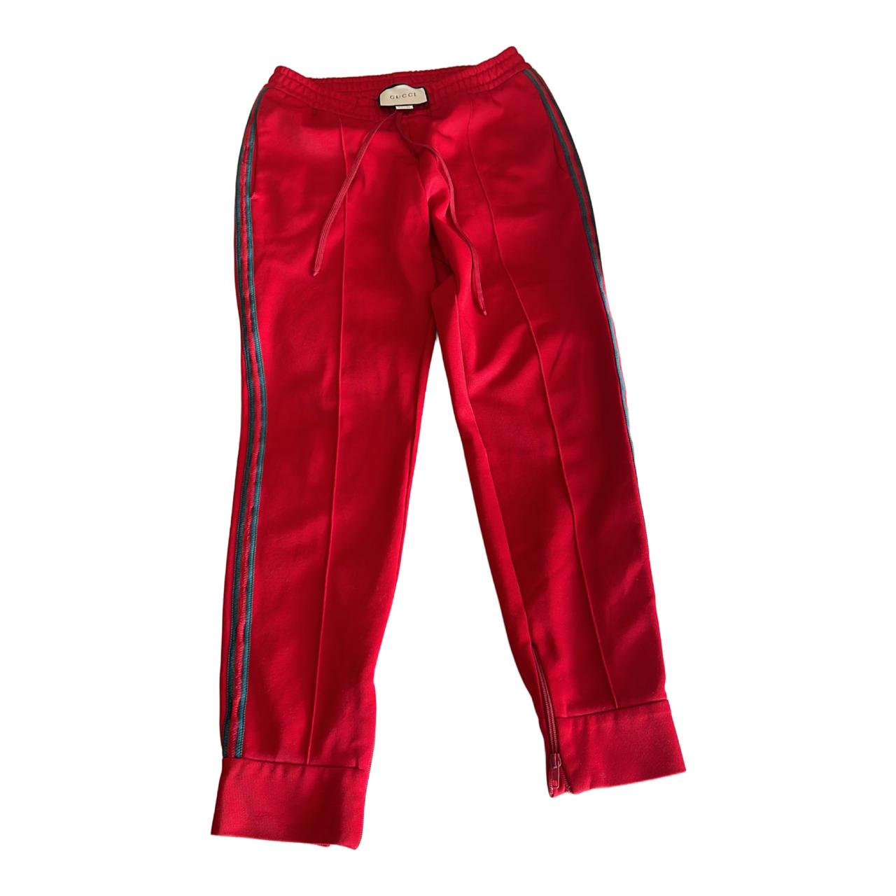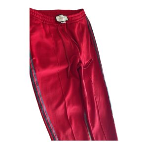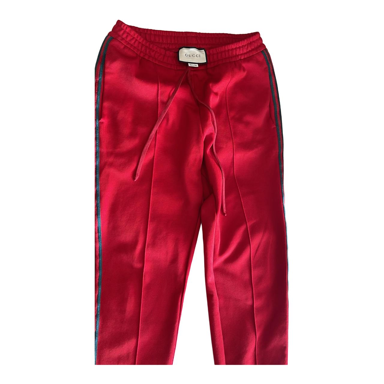 Bold and stylish red Gucci sweatpants featuring the iconic designer detailing. Comfortable yet luxurious, this versatile piece can be dressed up with sneakers for a streetwear look or paired casually for everyday wear. 100% authentic Gucci – statement designer piece.