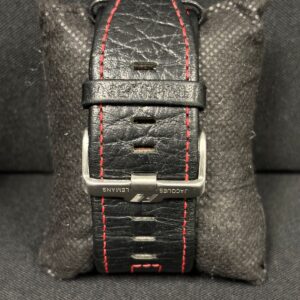 The dial showcases a striking black background with contrasting white sub-dials, enhancing readability. The chronograph function includes a 60-second and 60-minute counter, allowing for precise timing of events. A date window is positioned at the 4 o’clock mark, adding to the watch’s functionality.