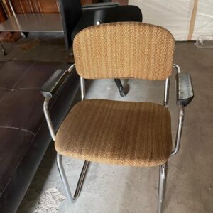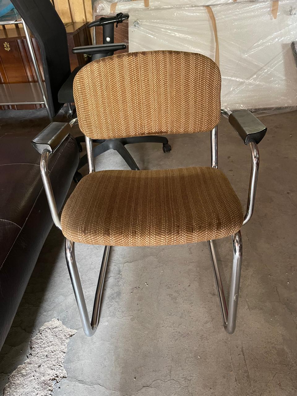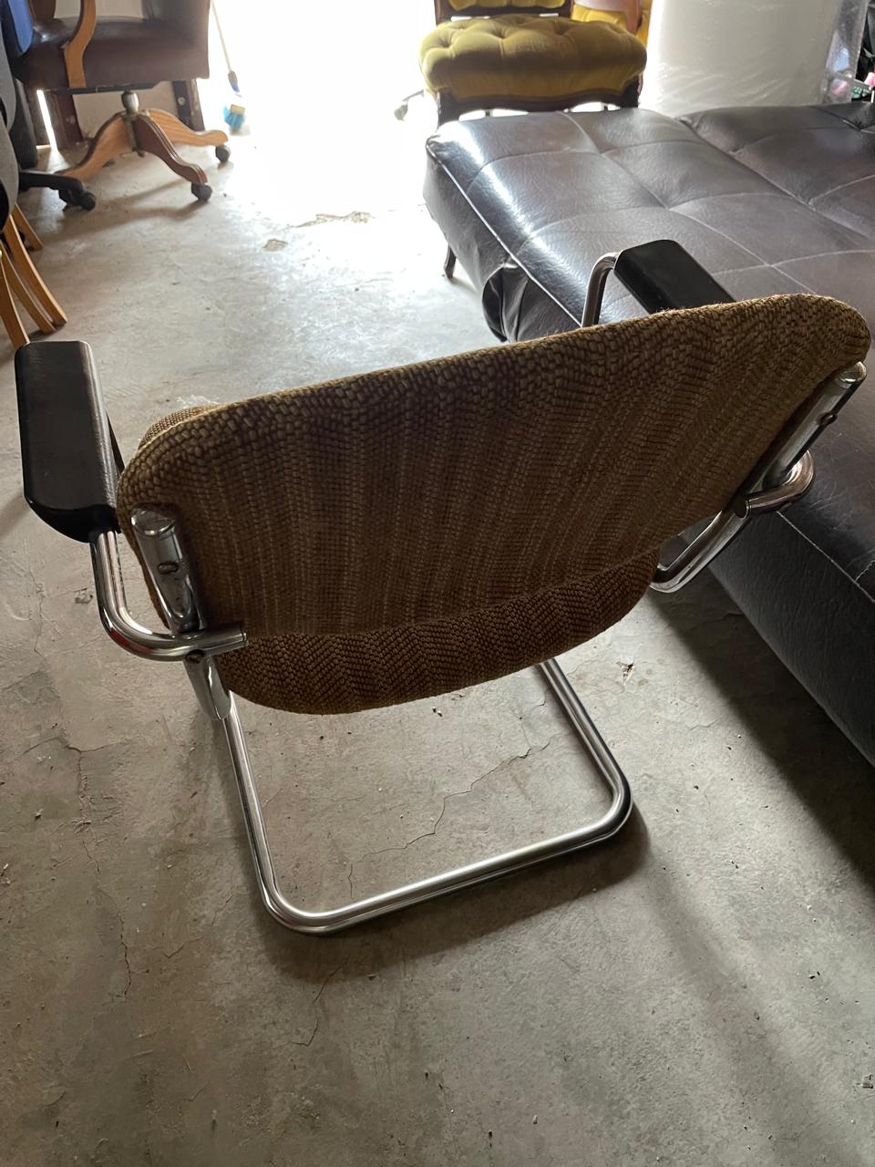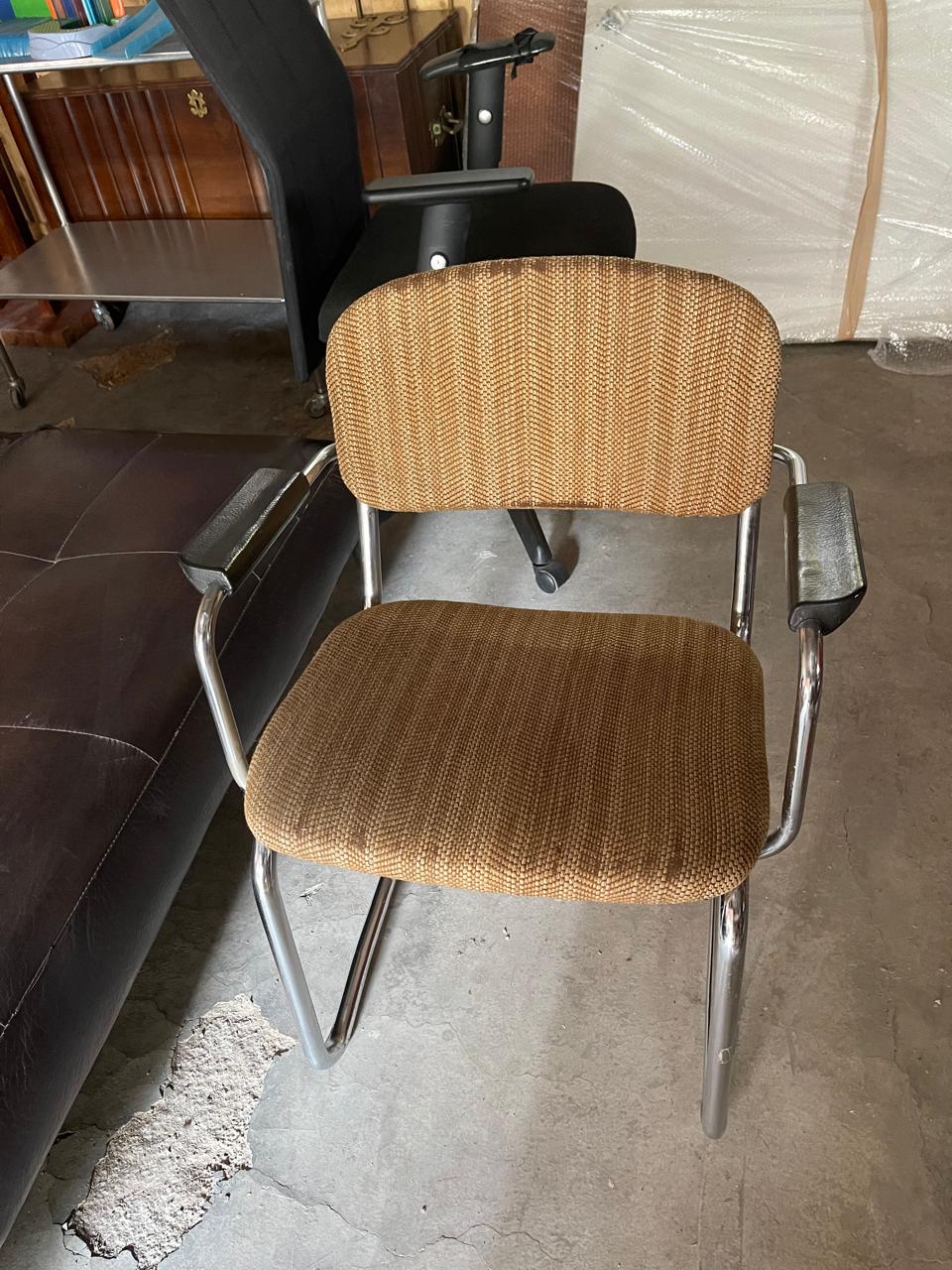Office chair with brown tweed fabric seat and backrest, chrome legs and armrests. Functional and sturdy for a home office, study, or small workspace.