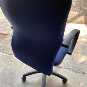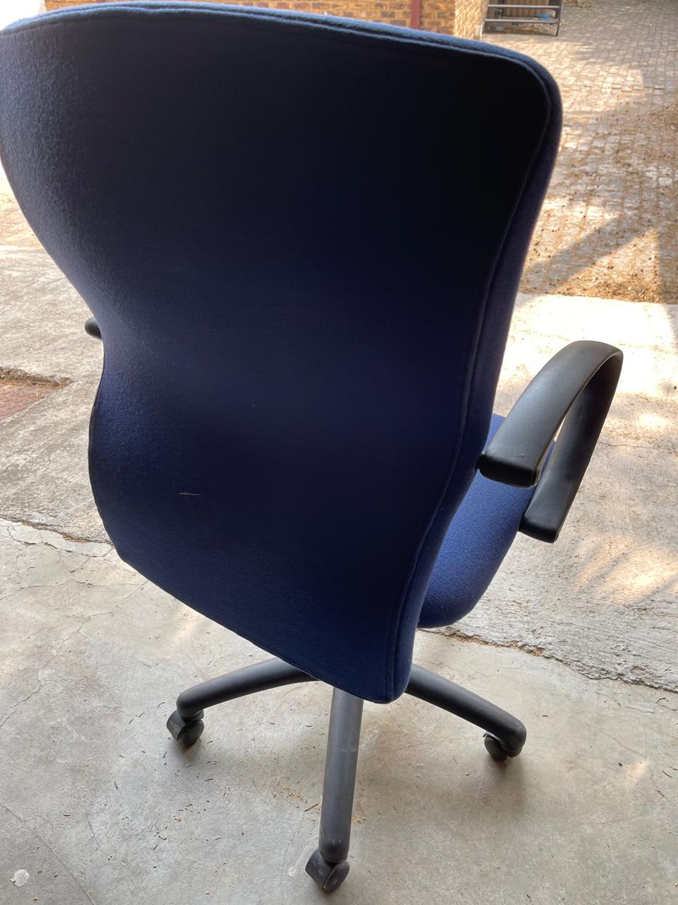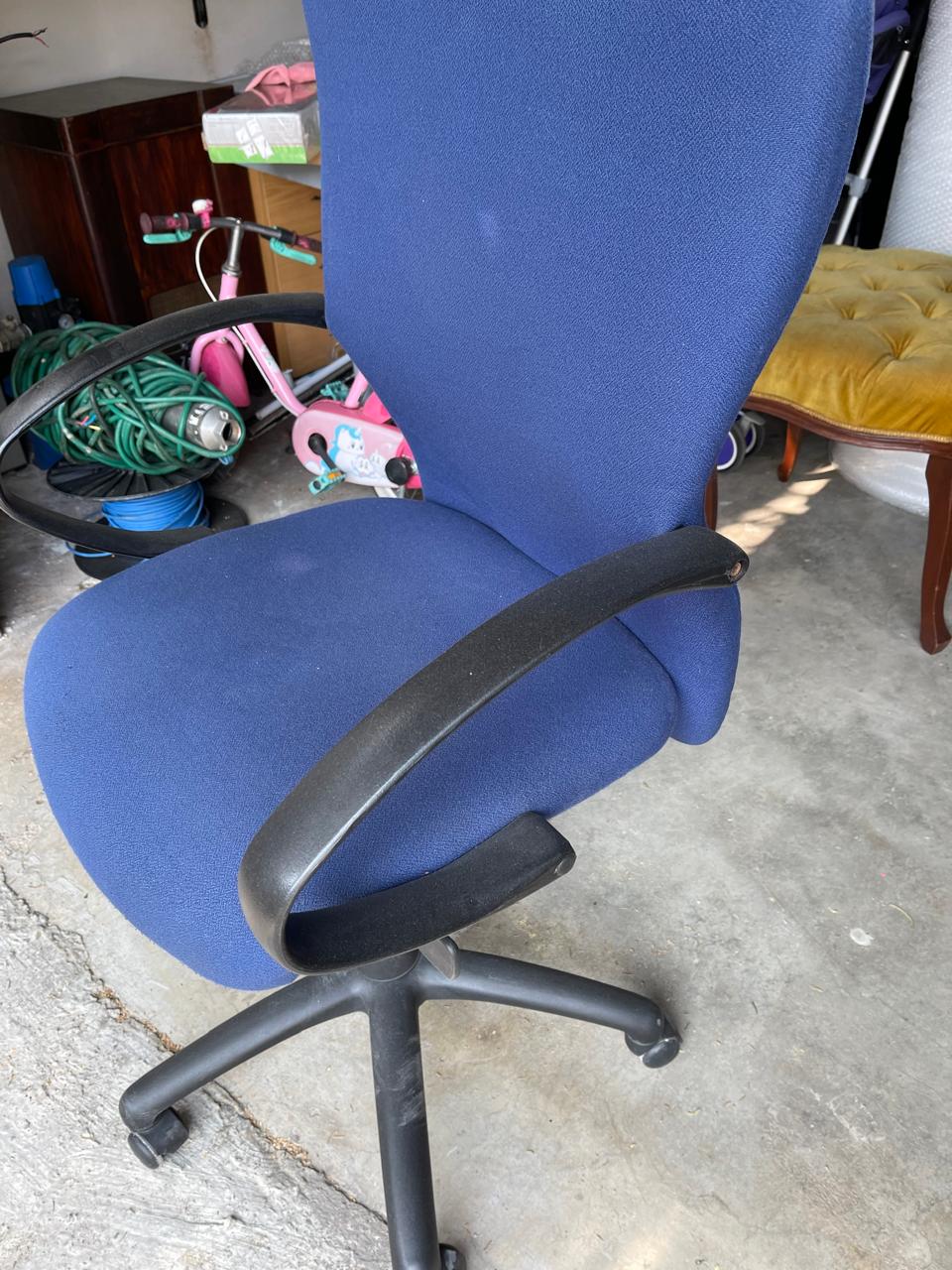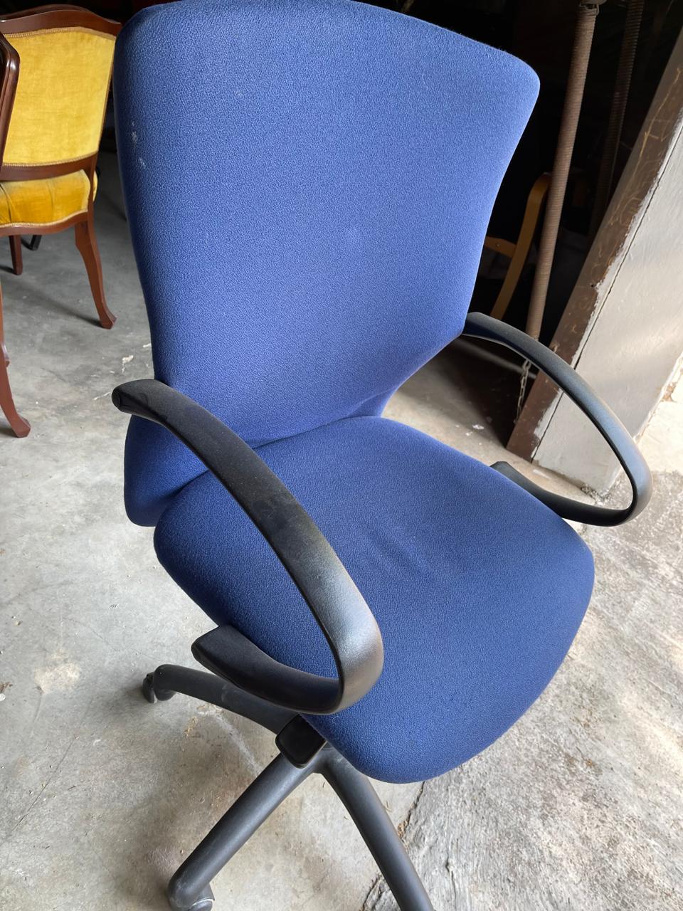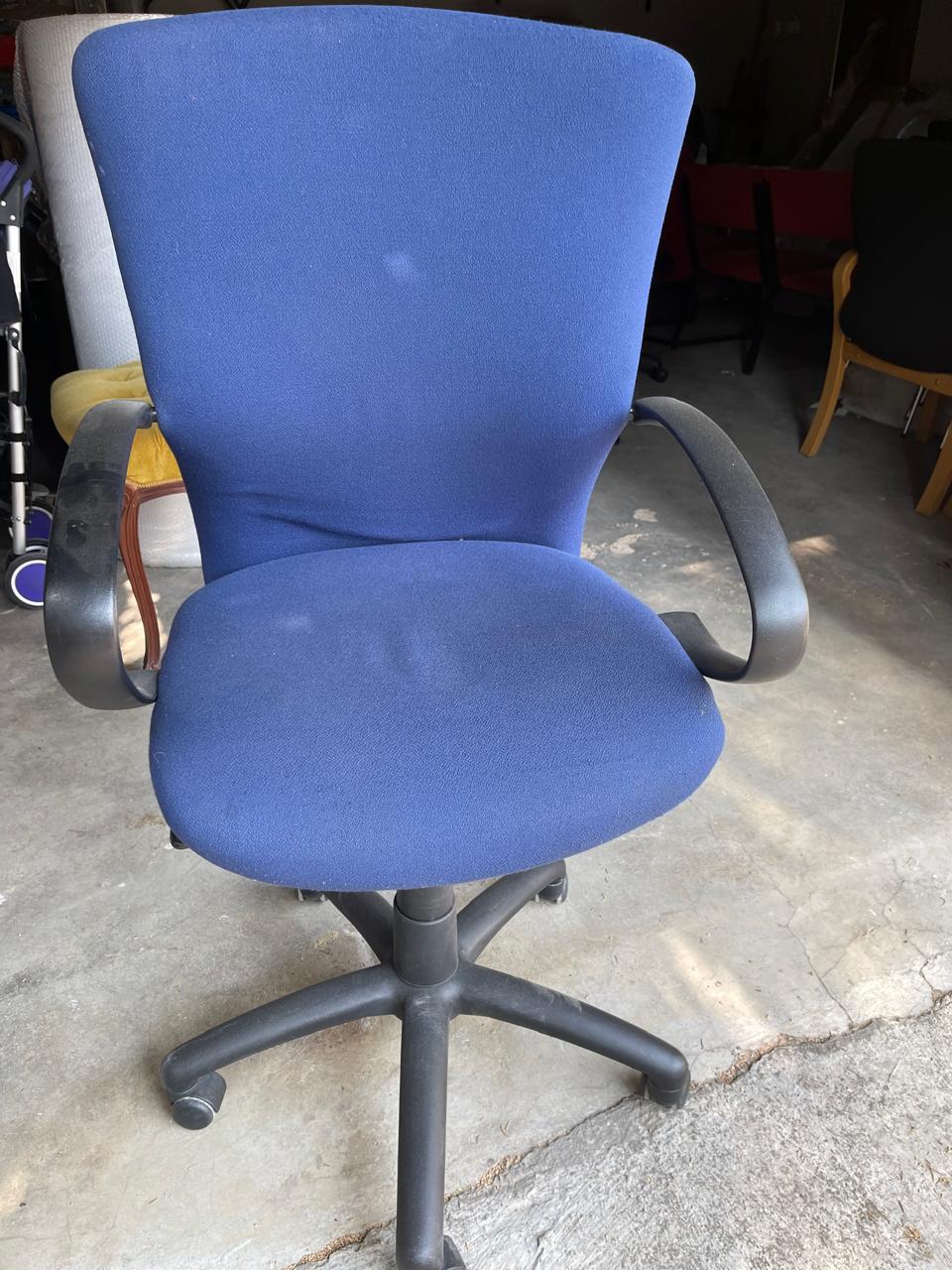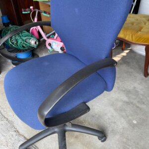 Office chair with comfortable padding and armrests. Features a swivel base with wheels for easy mobility and adjustable height. Chair is in good working condition with minor signs of normal use. Ideal for home or office workspace.